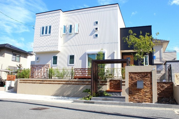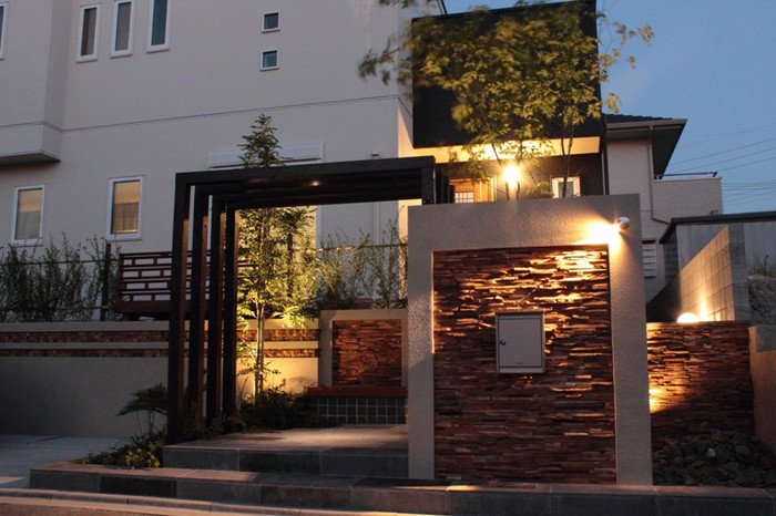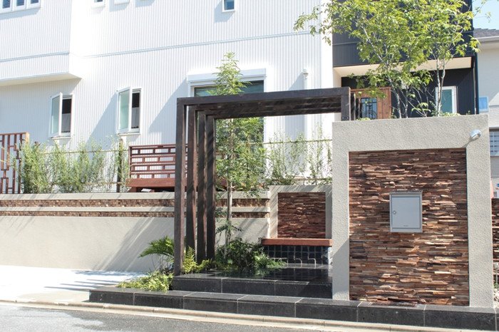 ウォーリングのスリットにはテキサスロックンウォールの“キューブ”を使用しました。ウッドモニュメントが一層アジアンリゾートの雰囲気を出しています。アイアンの手すりは創志園のオリジナルデザイン。