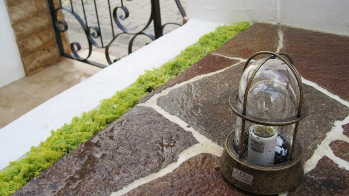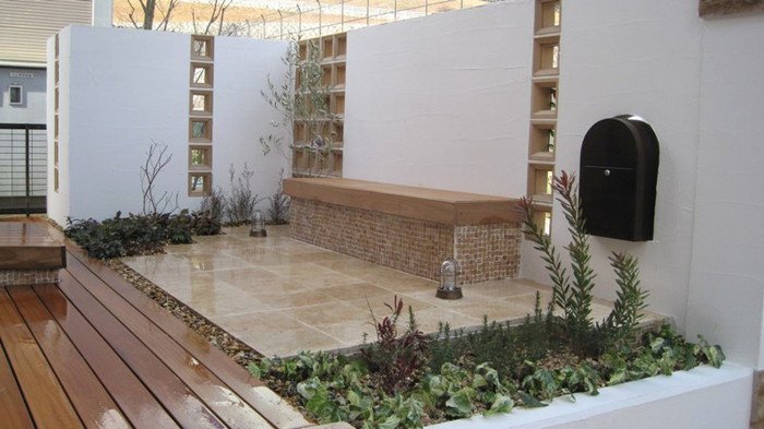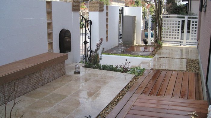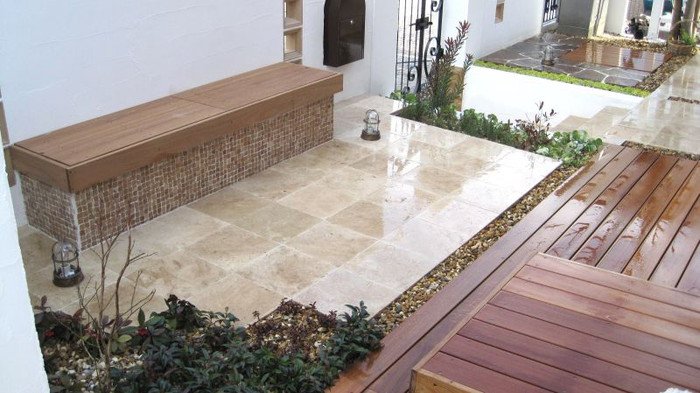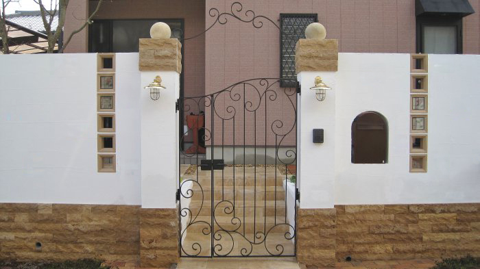 キュートでエレガントなフロントヤードにリフォーム。アイアン扉、アーチ、格子は創志園のオリジナルデザインで製作。トラバーチンの階段をあがると、トラバーチン張りのフロア、ベンチのある落ち着ける空間があります