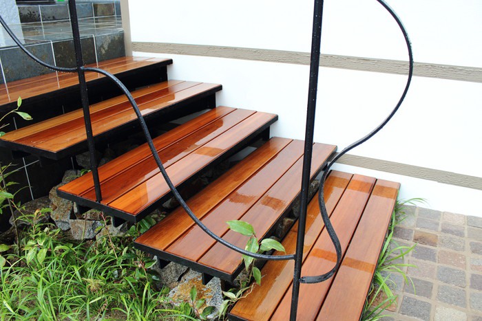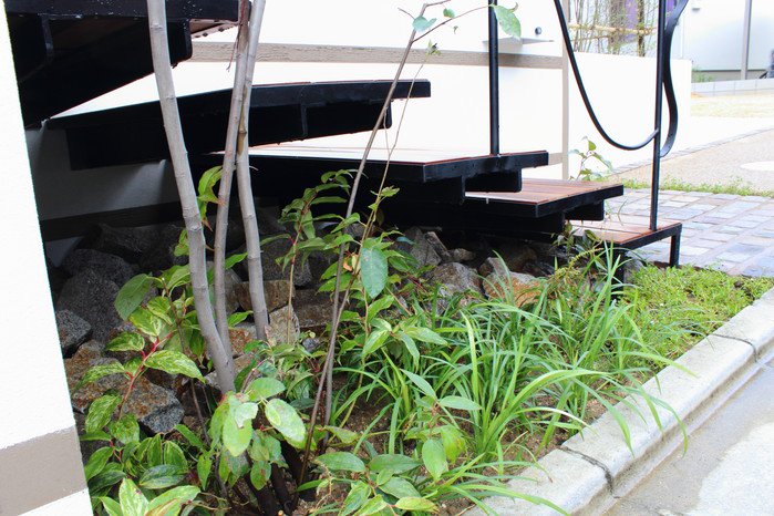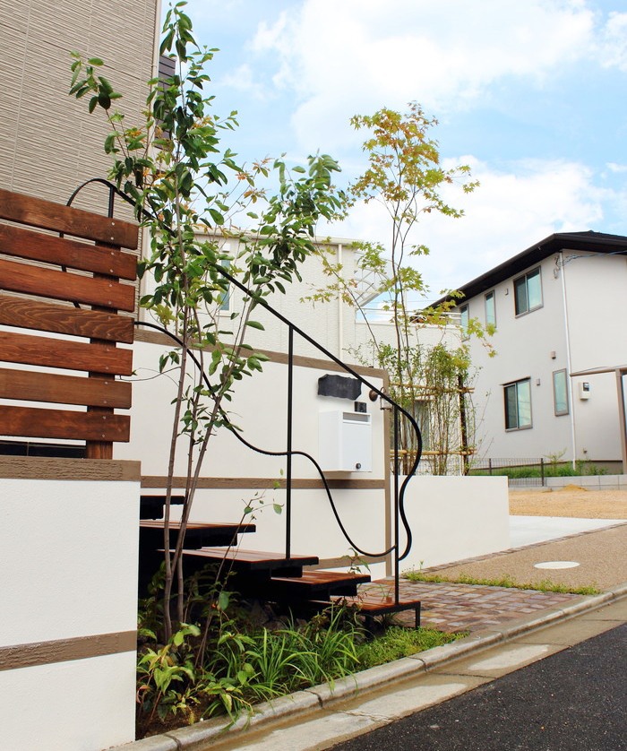 アイアン×ウッドの浮いている階段が印象的な外構デザイン。柔らかい曲線のアイアン手すりが植物の緑と馴染んで調和しています。