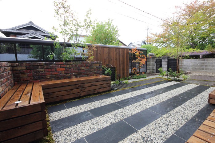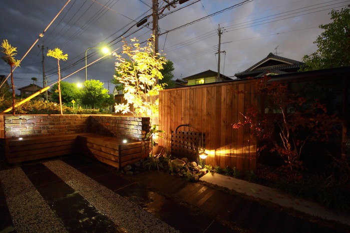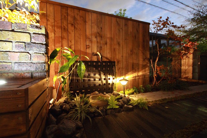ウッドにセラミックブロックを合わせたウォーリングや、レンガ×ウッドのベンチに囲われたプライベートガーデン。アイアン製のゴツゴツと無骨な表情に仕上げたパイプから水鉢へ水が流れ落ちます。