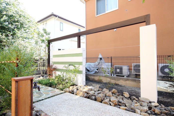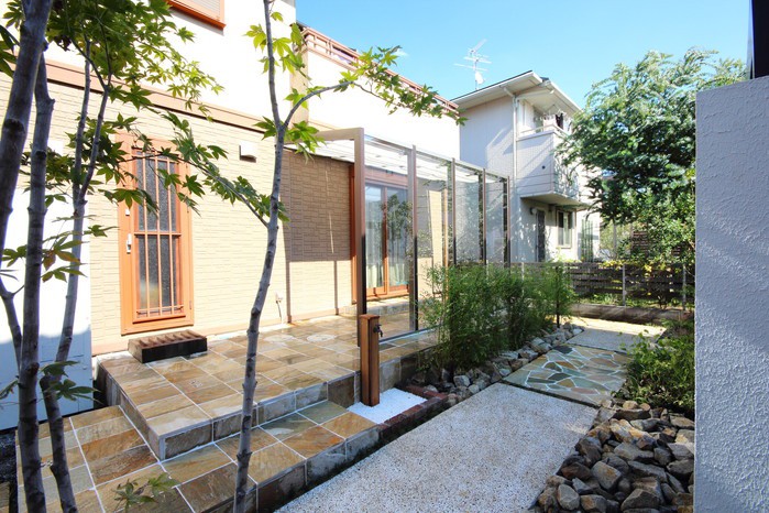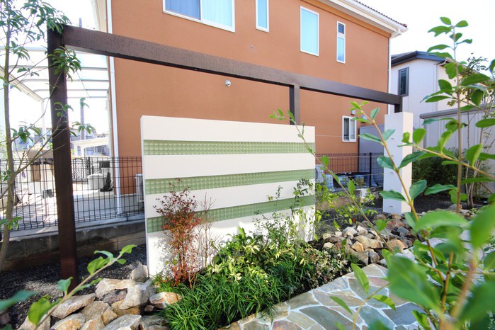 アルビノクォーツ張りの広々としたテラスにココマⅡのサイドスルータイプを。プラスGのパーツを組み合わせたデザインウォーリングにはFRPフェンス&ステンレスワイヤーを。