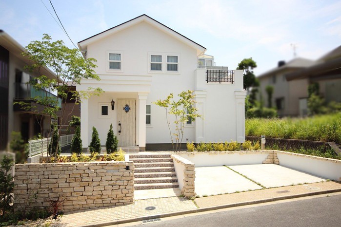 クロアチア産の石灰岩を積んだダイナミックな門柱が目を引くフロントヤード。エイジングにより更に良さを増す自然素材での構成に。