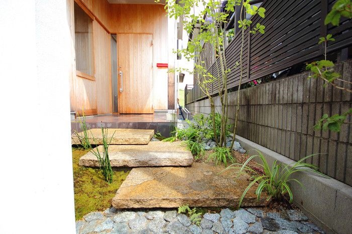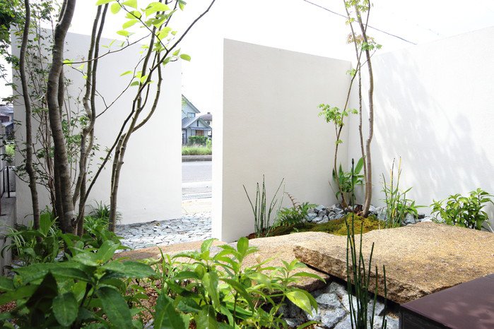 植物に囲まれた通路を楽しむフロントヤード。玄関側から眺めるとまた違った表情を見せるグリーンが広がります。