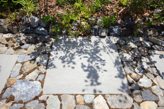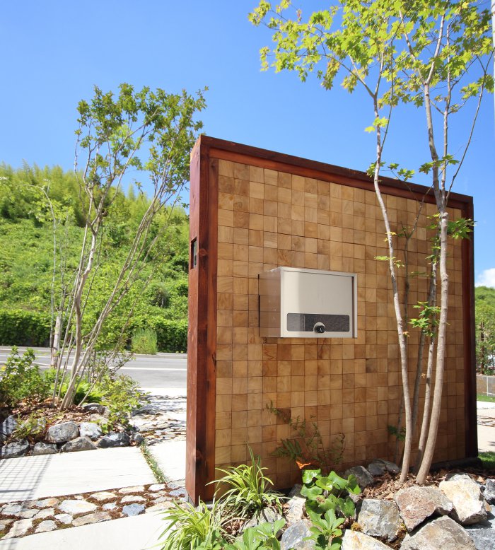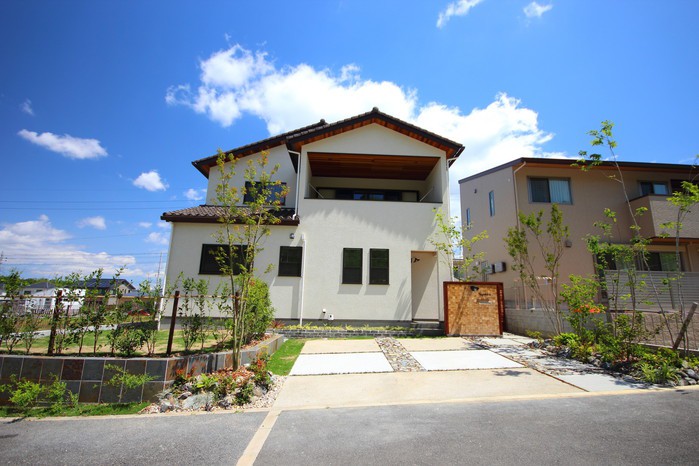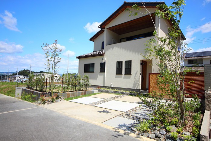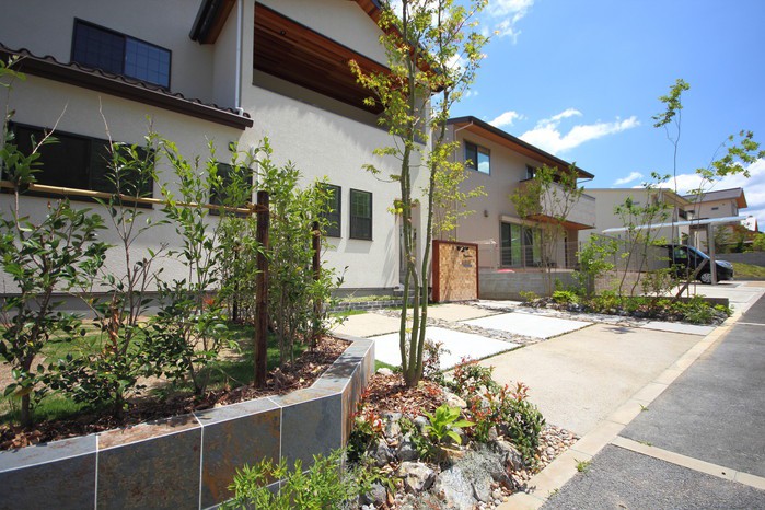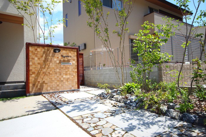 material&keyword:石貼り,アプローチ,アイアンサイン,アイアン表札,木のタイル,生漆,ウッドルーバーフェンス,木津川市城山台,雑木,駐車場削り出し,コンクリート土間削り出し