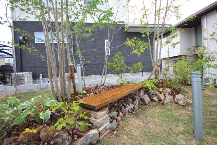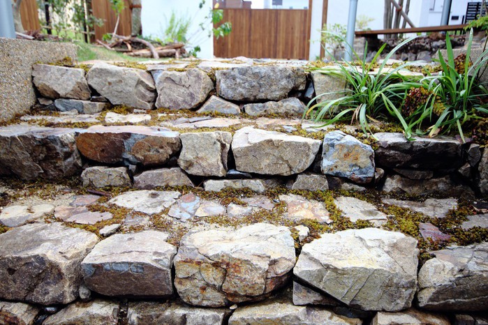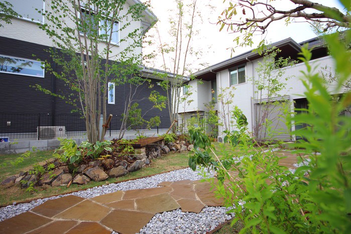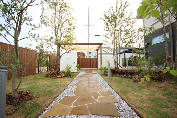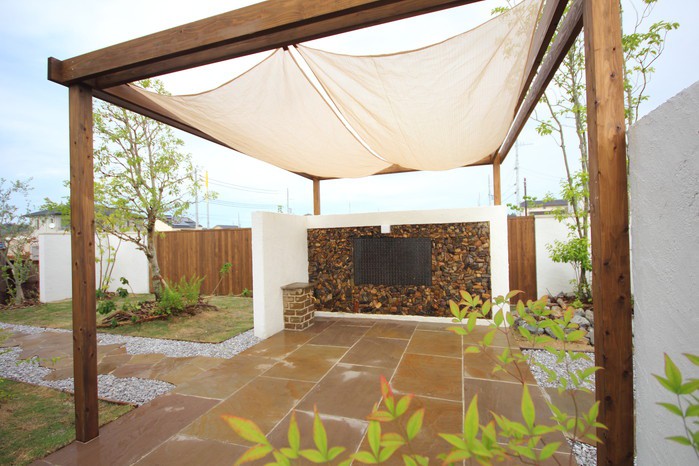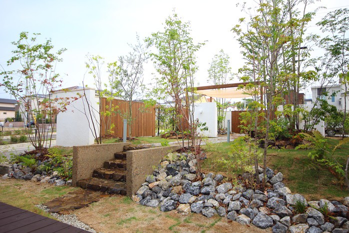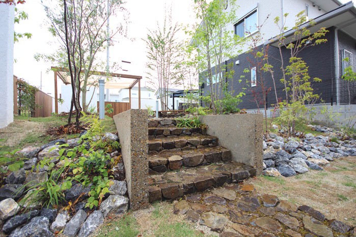 material&keyword:近江石,天狗石,飛び石,石組み,石の階段,和漆喰,漆喰の壁,木製パーゴラ,シェード,タープ,雑木,削り出し,ヴィスタストーンサンドラジグリーン,木化石,モニュメント,庭,庭づくり