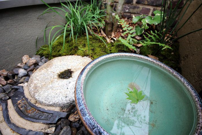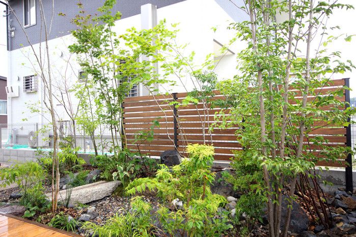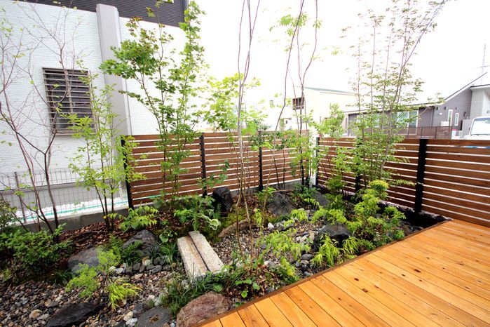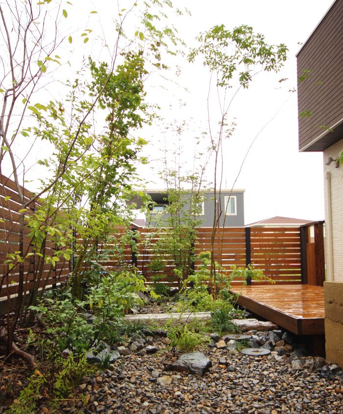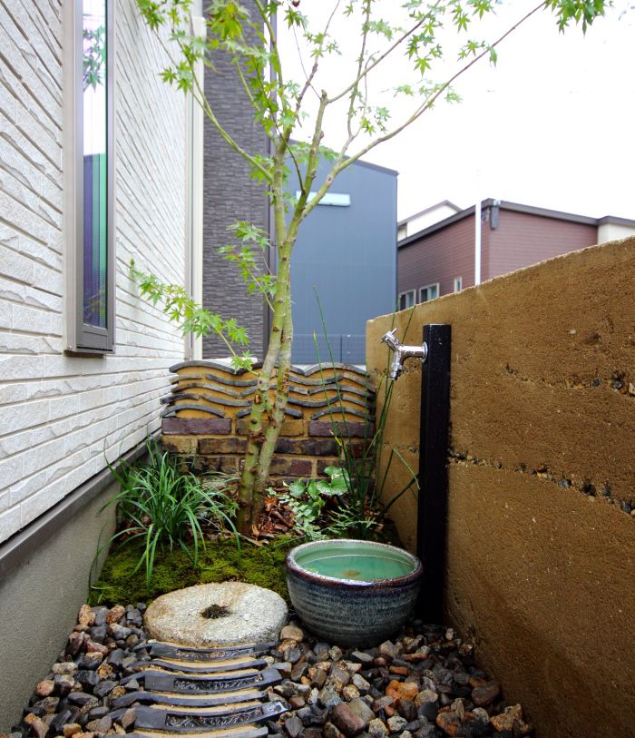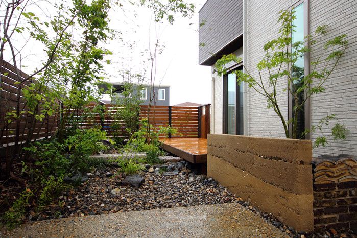 material&keyword:雑木,苔,ウッドデッキ,目隠し,版築土塀,立水柱,水鉢,信楽焼き,三和土,土間たたき