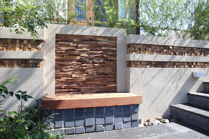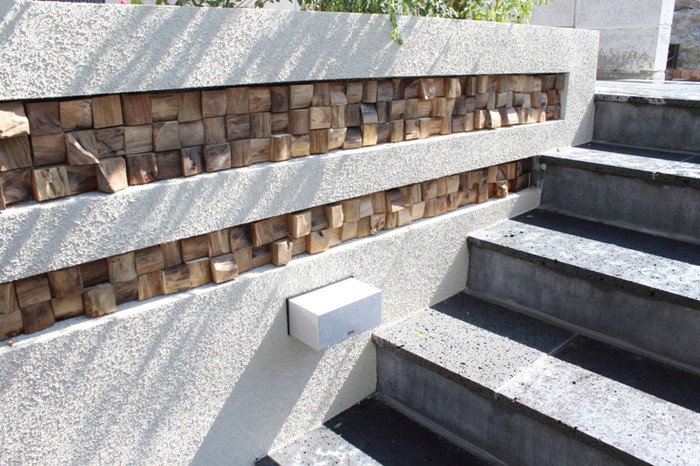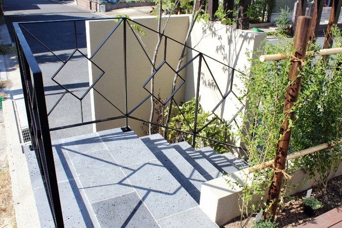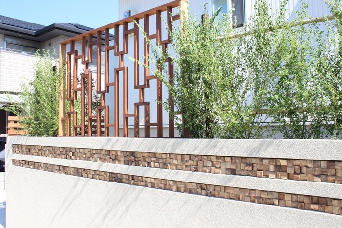 ウォーリングのスリットにはテキサスロックンウォールの“キューブ”を使用しました。ウッドモニュメントが一層アジアンリゾートの雰囲気を出しています。アイアンの手すりは創志園のオリジナルデザイン。