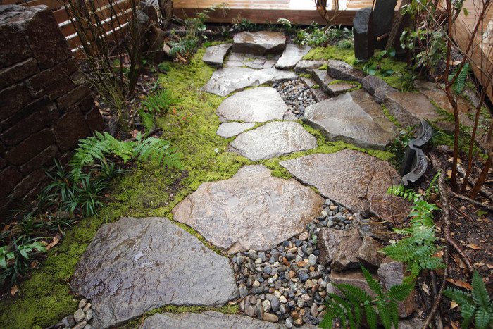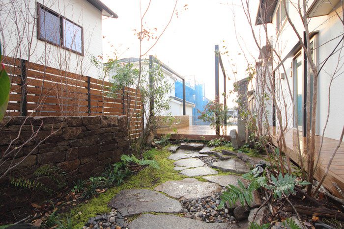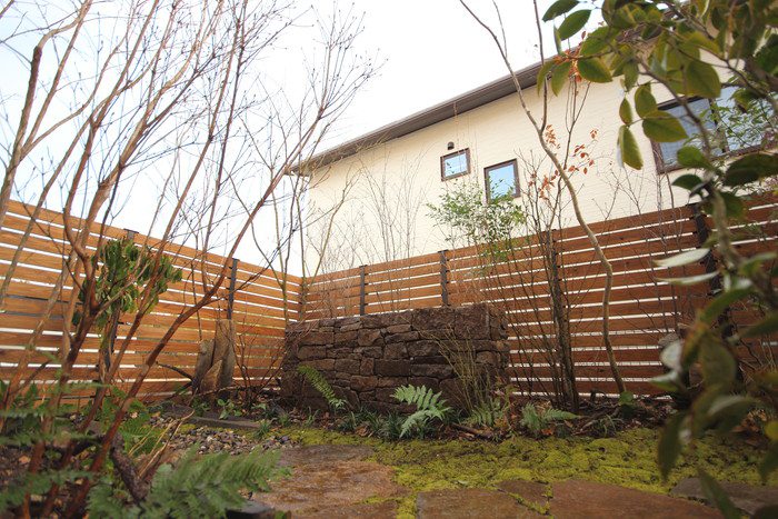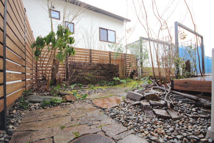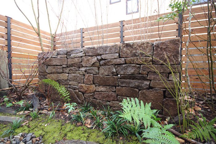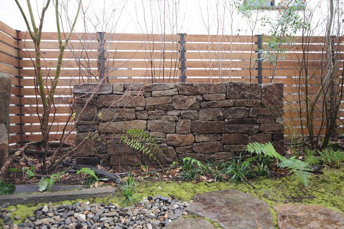 material&keyword:氣良石,気良石,飛び石,石積み,小端積み,野面積み,版築,土塀,雑木,苔,六方石,ウッドデッキ,三和土,土間たたき