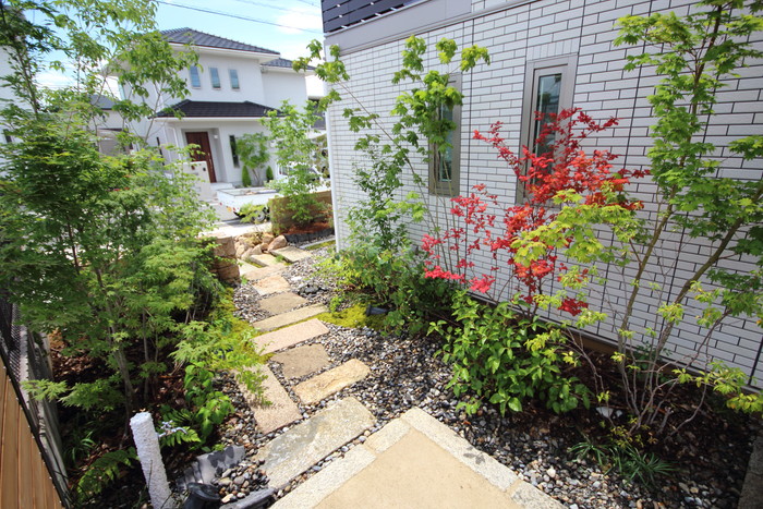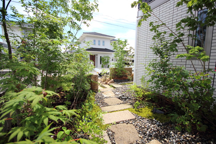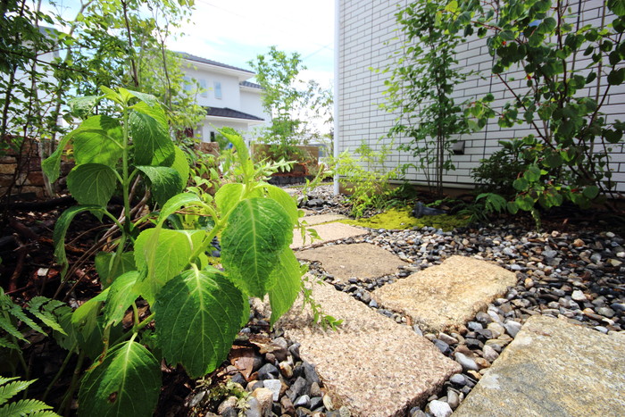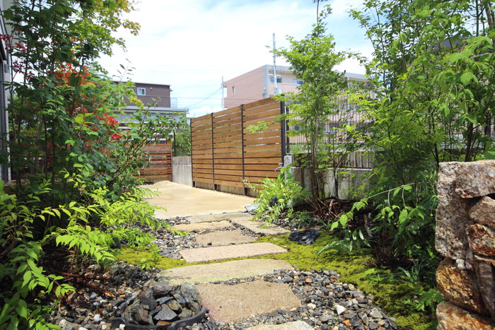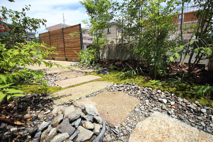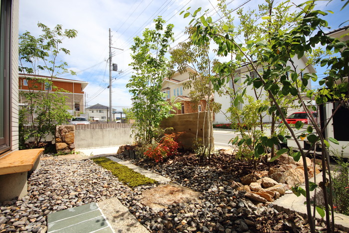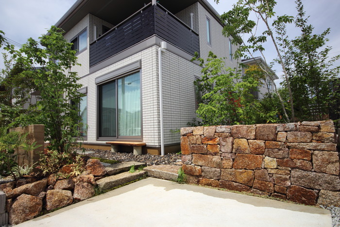 material&keyword:古石平板,信楽石,甲賀石,石積み,瓦,雑木,ペブル立水柱,三和土,土間たたき,柿渋塗料,ウッドデッキ