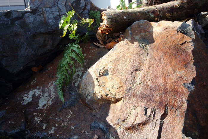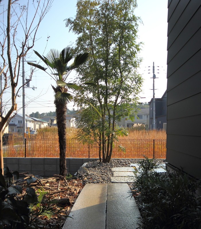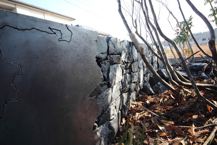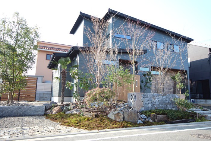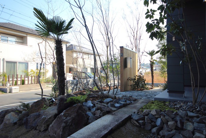 material&keyword:石積み,天狗石,ヴィスタストーン,白身影,ロックガーデン,景石,石組み,雑木,板塀,苔,落ち葉,腐植,アイアン,鉄板,オリエンタル,ガルバリウム