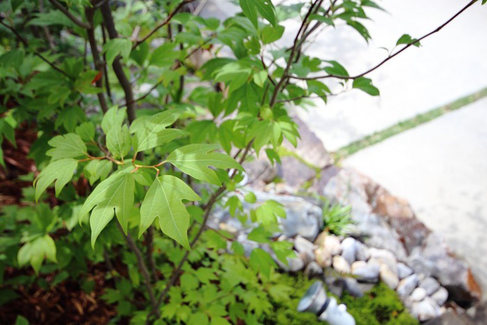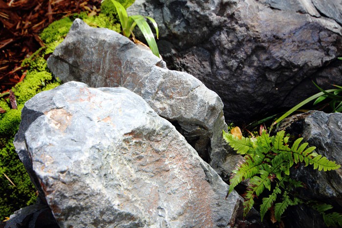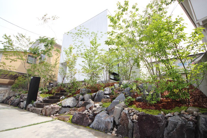 material&keyword:石積み,石組み,ロックガーデン,傾斜地,法面,川石,景石,,雑木,苔