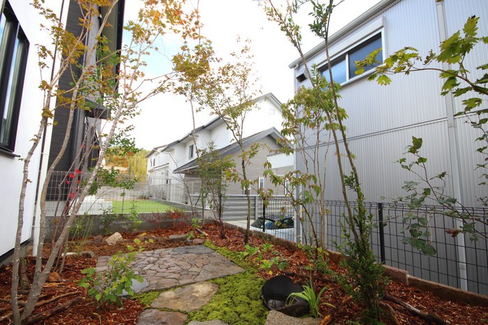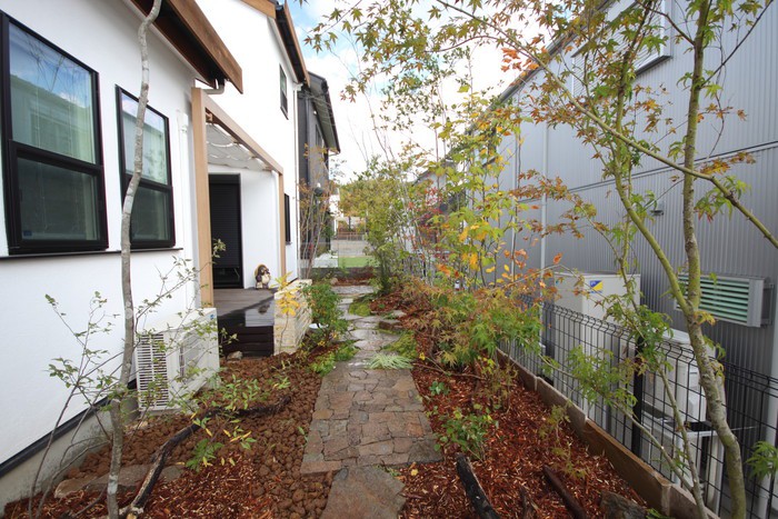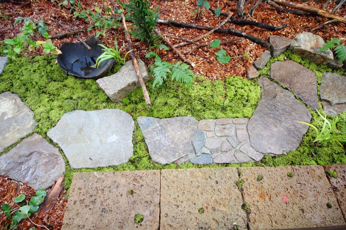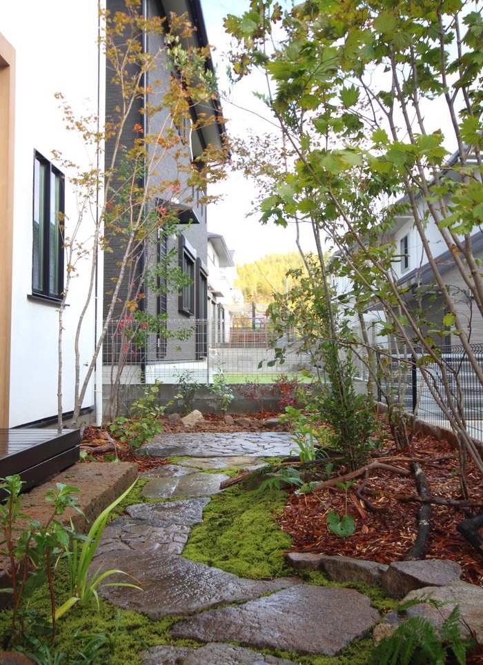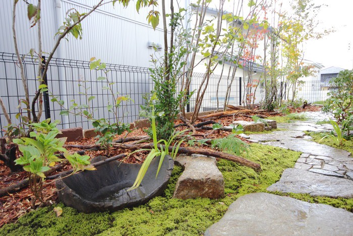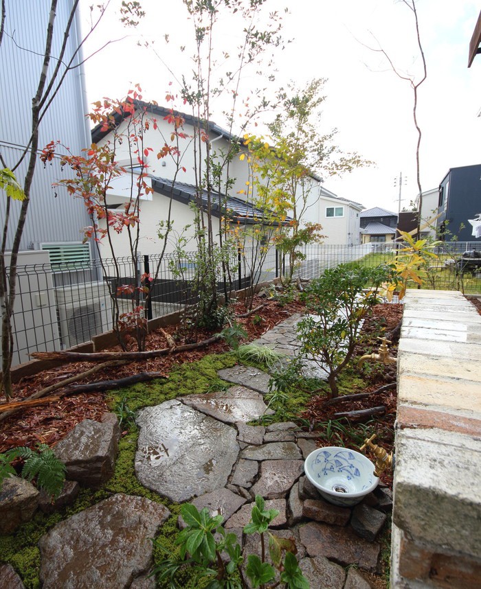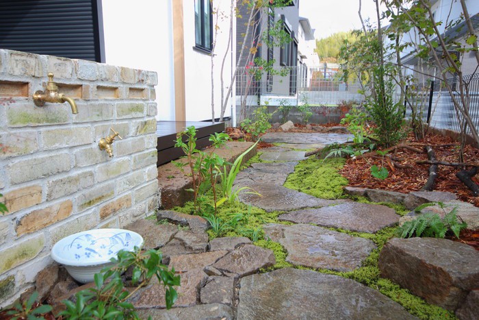 material&keyword:石張り,石貼り,氣良石,気良石,小道,小径,アプローチ,水鉢,雑木,苔,樹木,庭,庭づくり,ロマリアストーン,レンガ