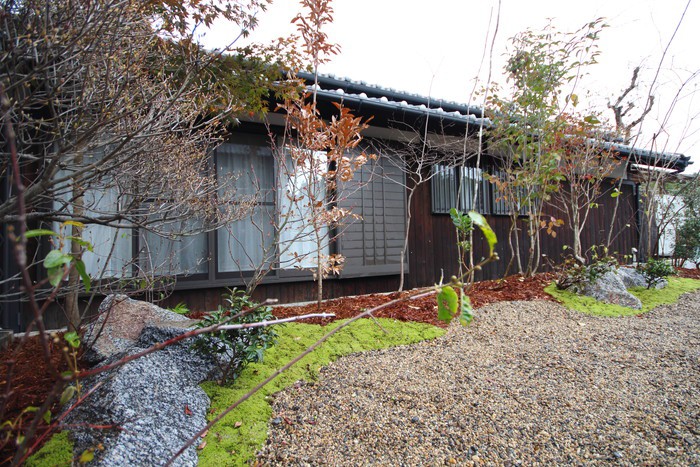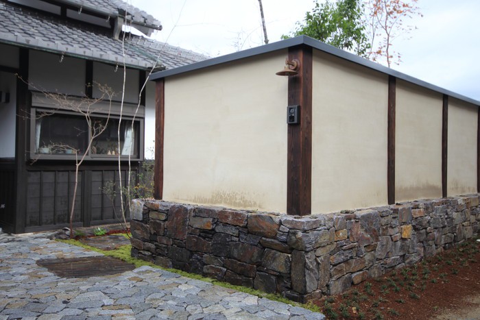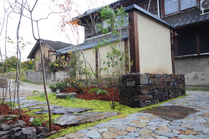 material&keyword:石積み,土壁,幡豆石,鹿川石,庵治石,石貼り,水鉢,雑木,苔,樹木,庭,庭づくり