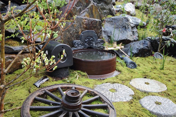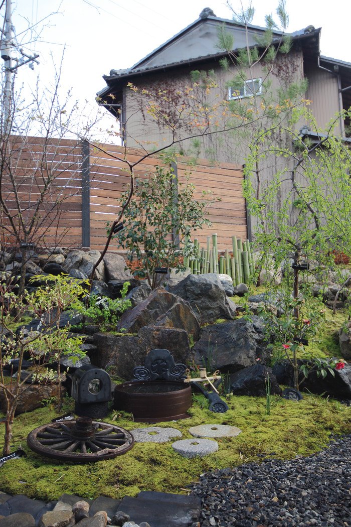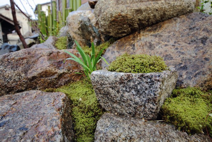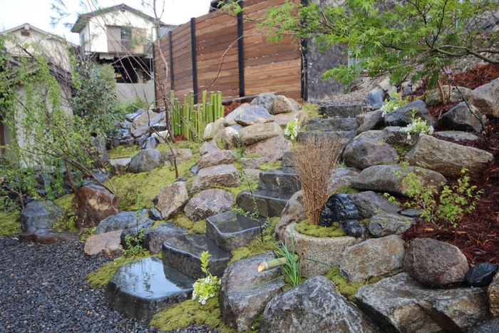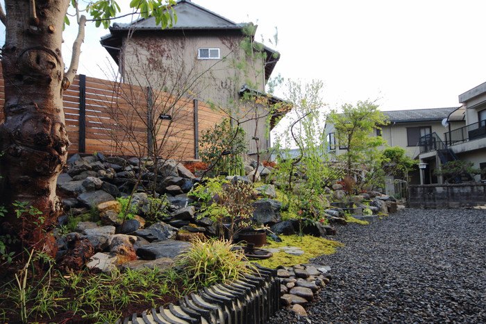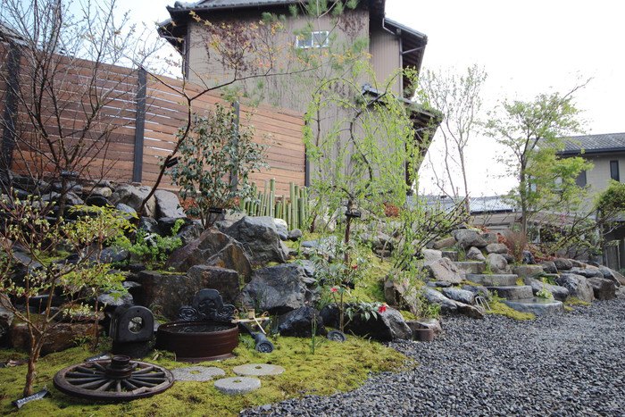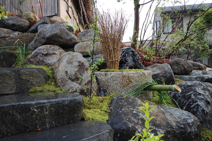 material&keyword:石組み,景石,水鉢,雑木,苔,樹木,庭,庭づくり,宿,ゲストハウス,和束町