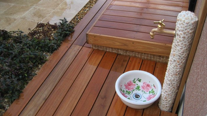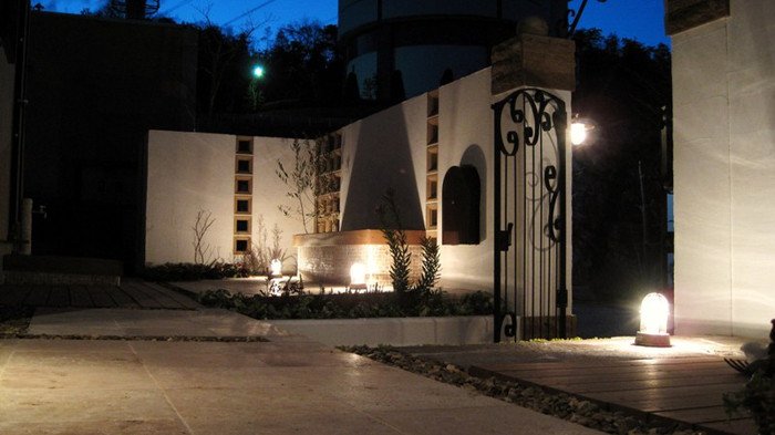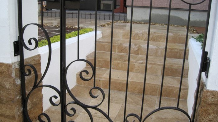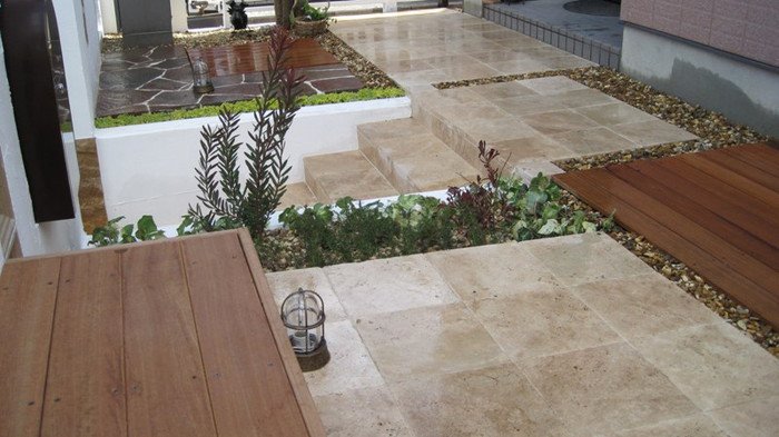 キュートでエレガントなフロントヤードにリフォーム。アイアン扉、アーチ、格子は創志園のオリジナルデザインで製作。トラバーチンの階段をあがると、トラバーチン張りのフロア、ベンチのある落ち着ける空間があります