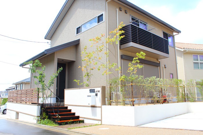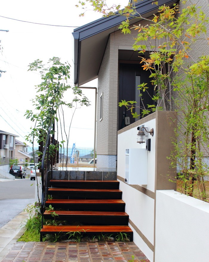 アイアン×ウッドの浮いている階段が印象的な外構デザイン。柔らかい曲線のアイアン手すりが植物の緑と馴染んで調和しています。