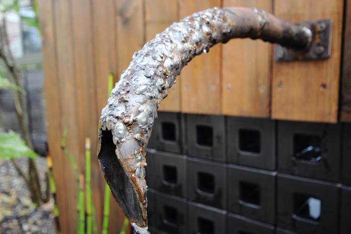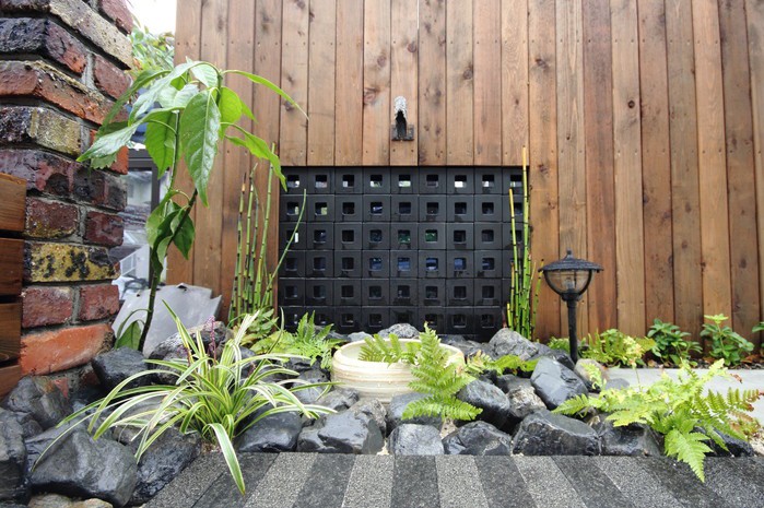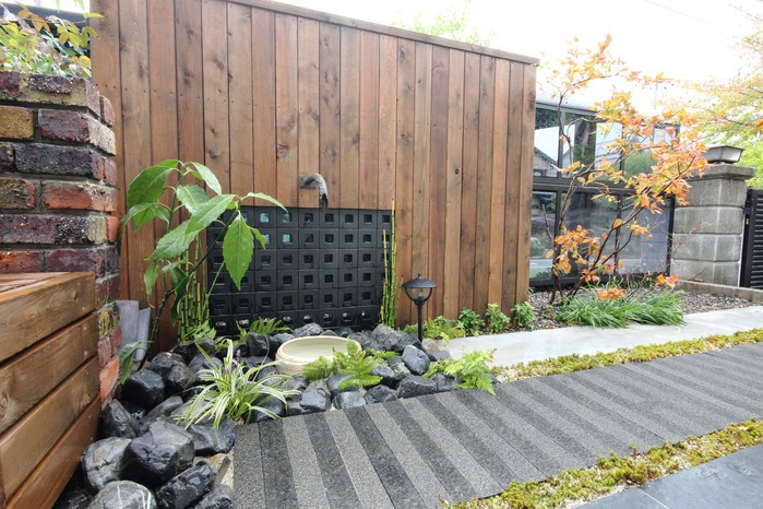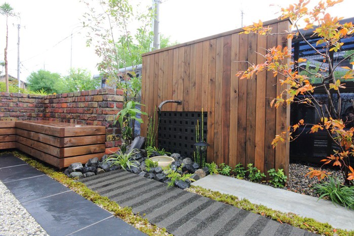 ウッドにセラミックブロックを合わせたウォーリングや、レンガ×ウッドのベンチに囲われたプライベートガーデン。アイアン製のゴツゴツと無骨な表情に仕上げたパイプから水鉢へ水が流れ落ちます。