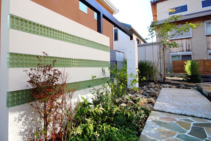 アルビノクォーツ張りの広々としたテラスにココマⅡのサイドスルータイプを。プラスGのパーツを組み合わせたデザインウォーリングにはFRPフェンス&ステンレスワイヤーを。