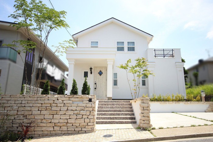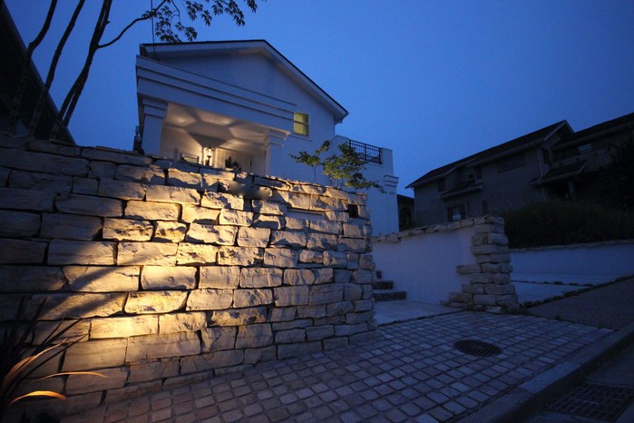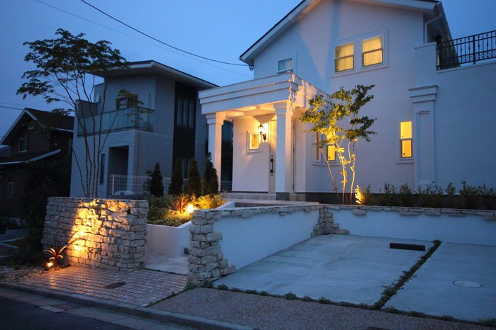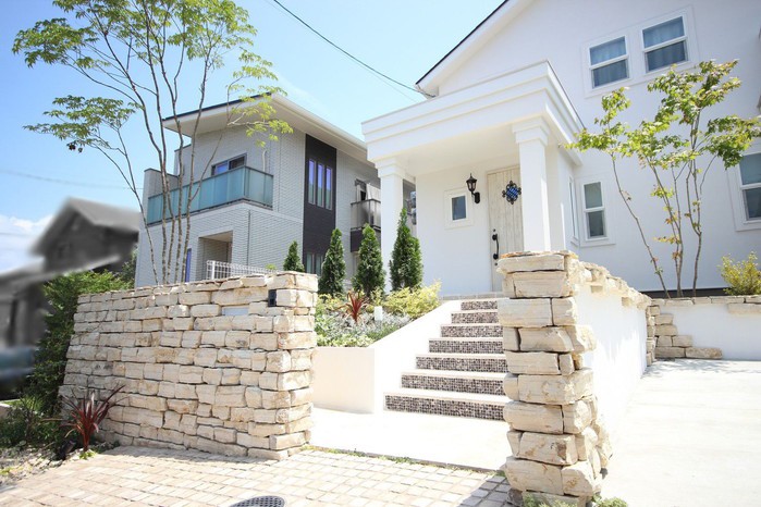 クロアチア産の石灰岩を積んだダイナミックな門柱が目を引くフロントヤード。エイジングにより更に良さを増す自然素材での構成に。