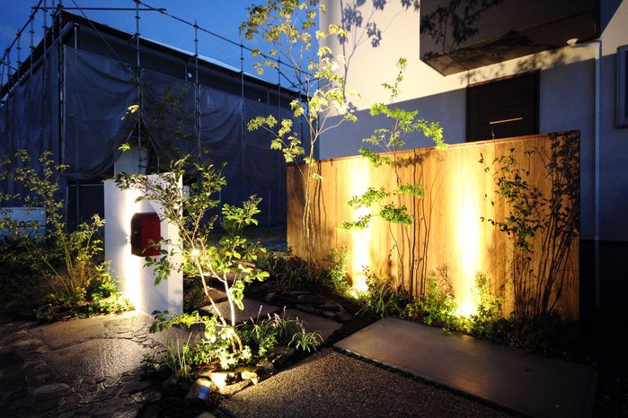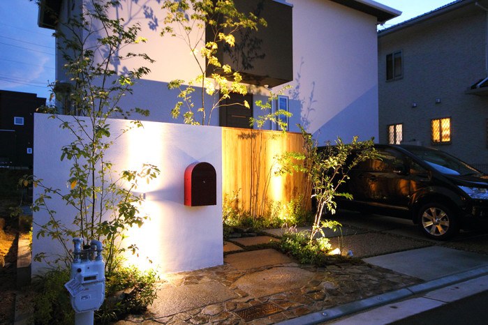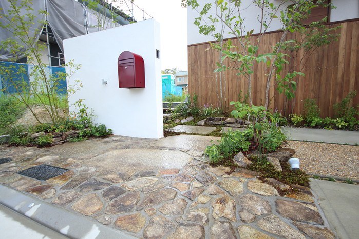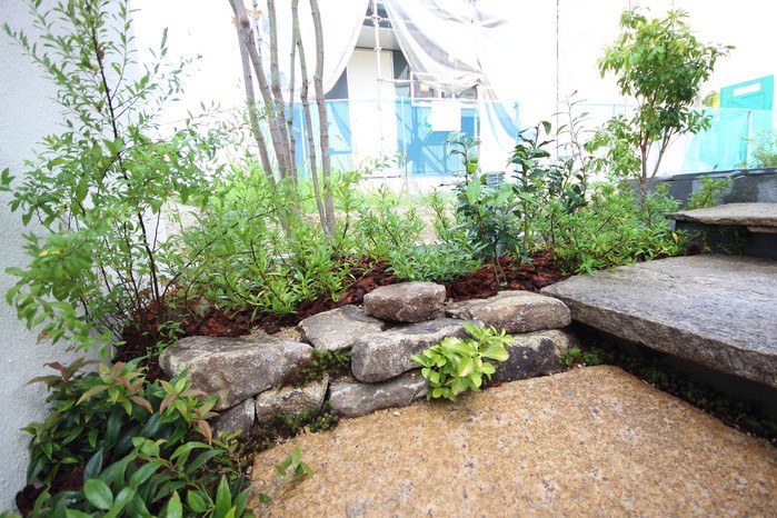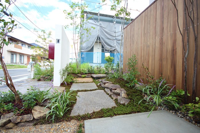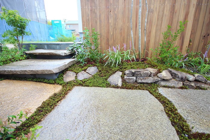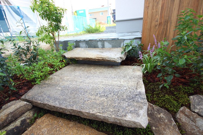material&keyword:美濃石延べ段,古石平板,白い壁,ボビ,木塀縦張り,雑木,苔