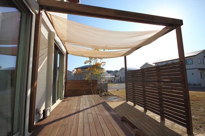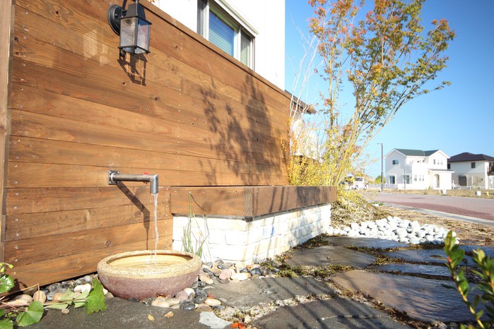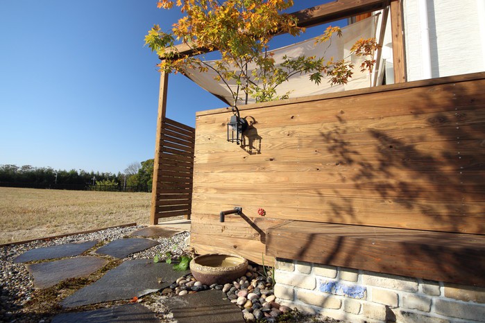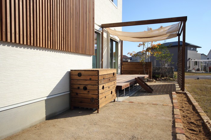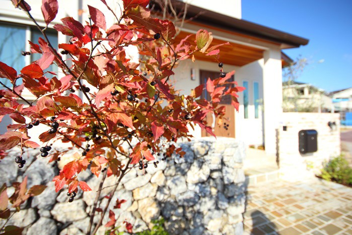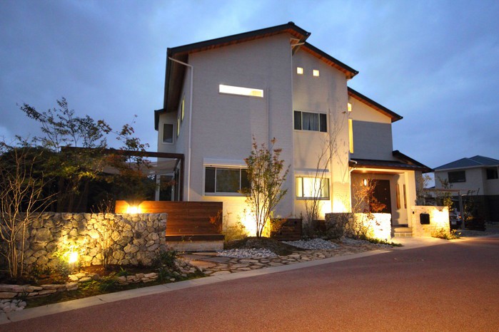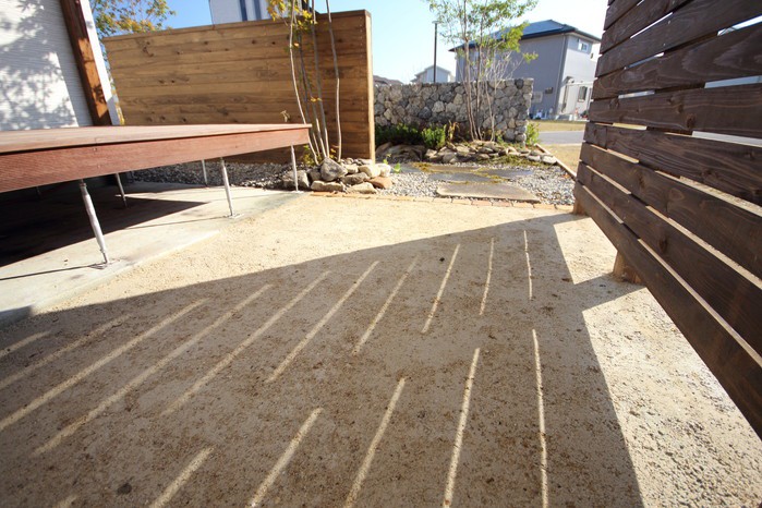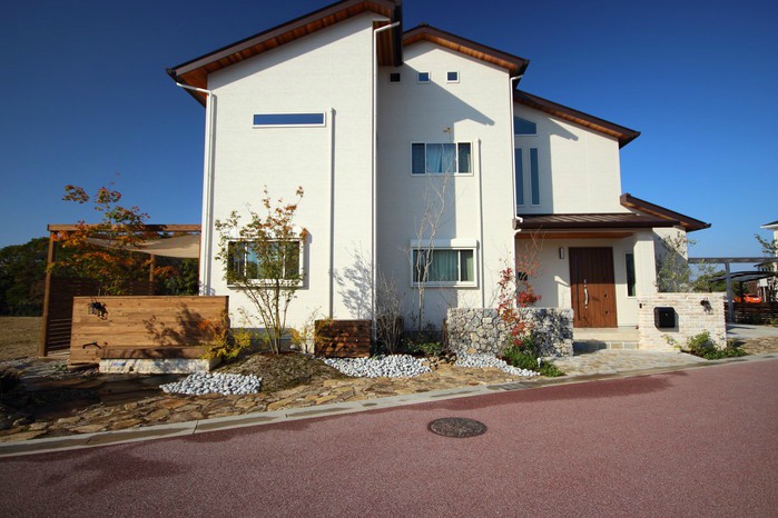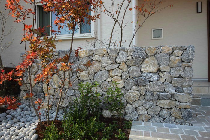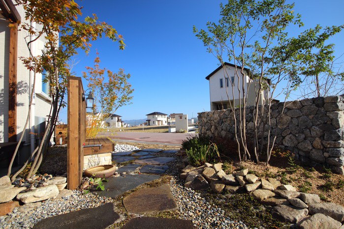 material&keyword:近江石,気良石,飛び石,石積み,白いレンガ門柱,石畳,ゴマシオ砂利,ウッドパーゴラ,タープ,シェード,雑木,苔,美濃石,石貼り駐車場,壁泉,信楽焼きの水鉢,三和土,土間たたき