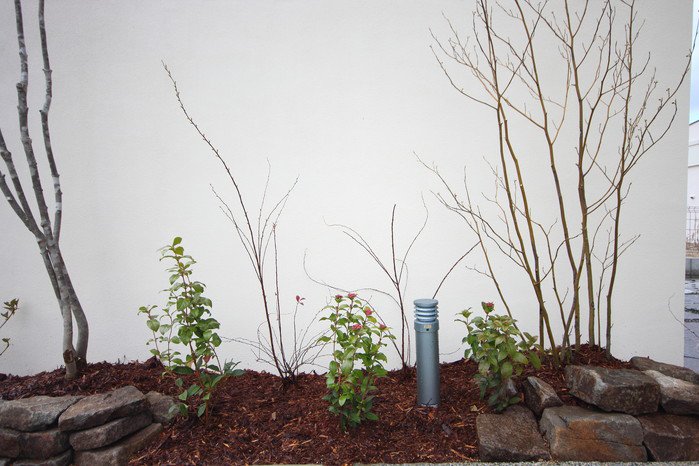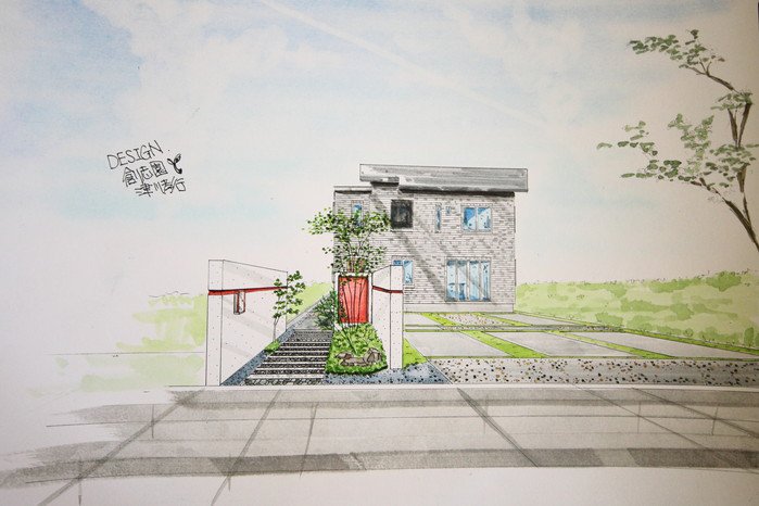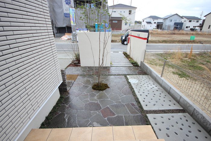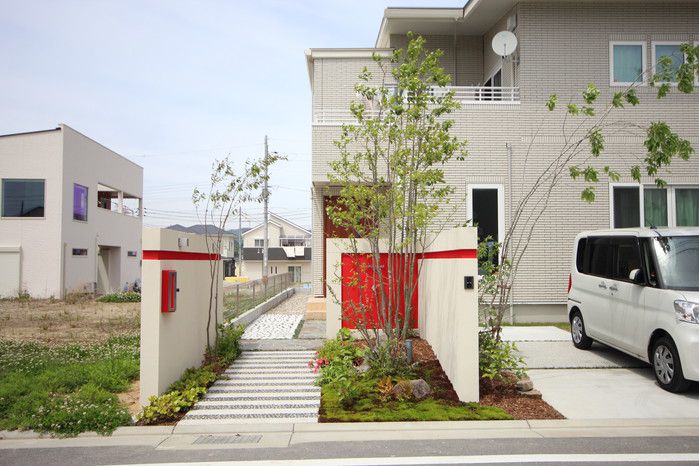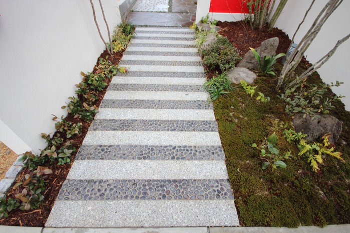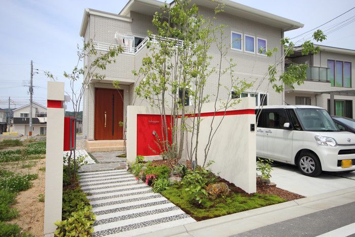 material&keyword:石のアプローチ,赤いポスト,アクセントカラー,雑木,苔,鉄平石,レンガの立水柱